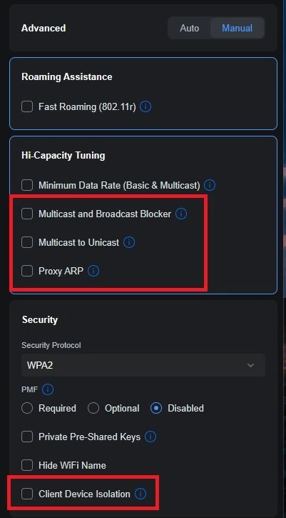 - Controleer de "Disable"-lijst: Ga terug naar de WiFi-instellingen hierboven en check driedubbel of Multicast and Broadcast Control en Multicast Enhancement uitstaan.