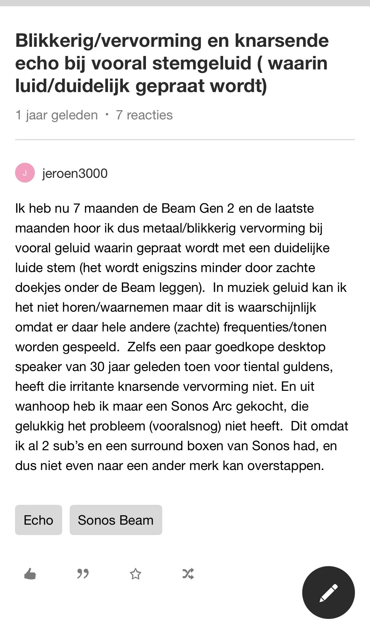 Hoi iedereen! Sinds een maandje of 2 heb ik ook een Sonos soundbar en wel de Sonos Beam Gen2. Helaas heb ik sinds gisteren last van een soort achtergrond geluid wat lijkt op stereo. Sorry alvast ik ben nooit goed in dingen uitleggen zoals ze zijn.
