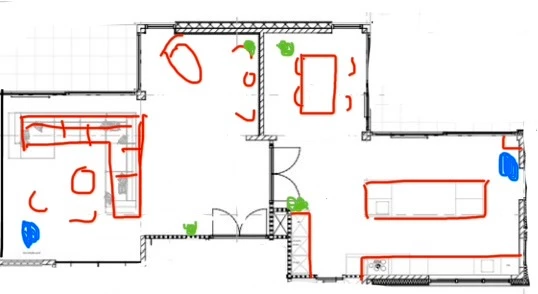 Heb een plattegrondje meegestuurd. In blauw de twee Era300 speakers, in groen de Era100 speakers. In de woonkamer is het geluid nu wel prima. Alle speakers staan op tafelhoogte. We zitten meestal aan de keukentafel of op de bank, maar het geluid bij het kookeiland vind ik ook belangrijk.